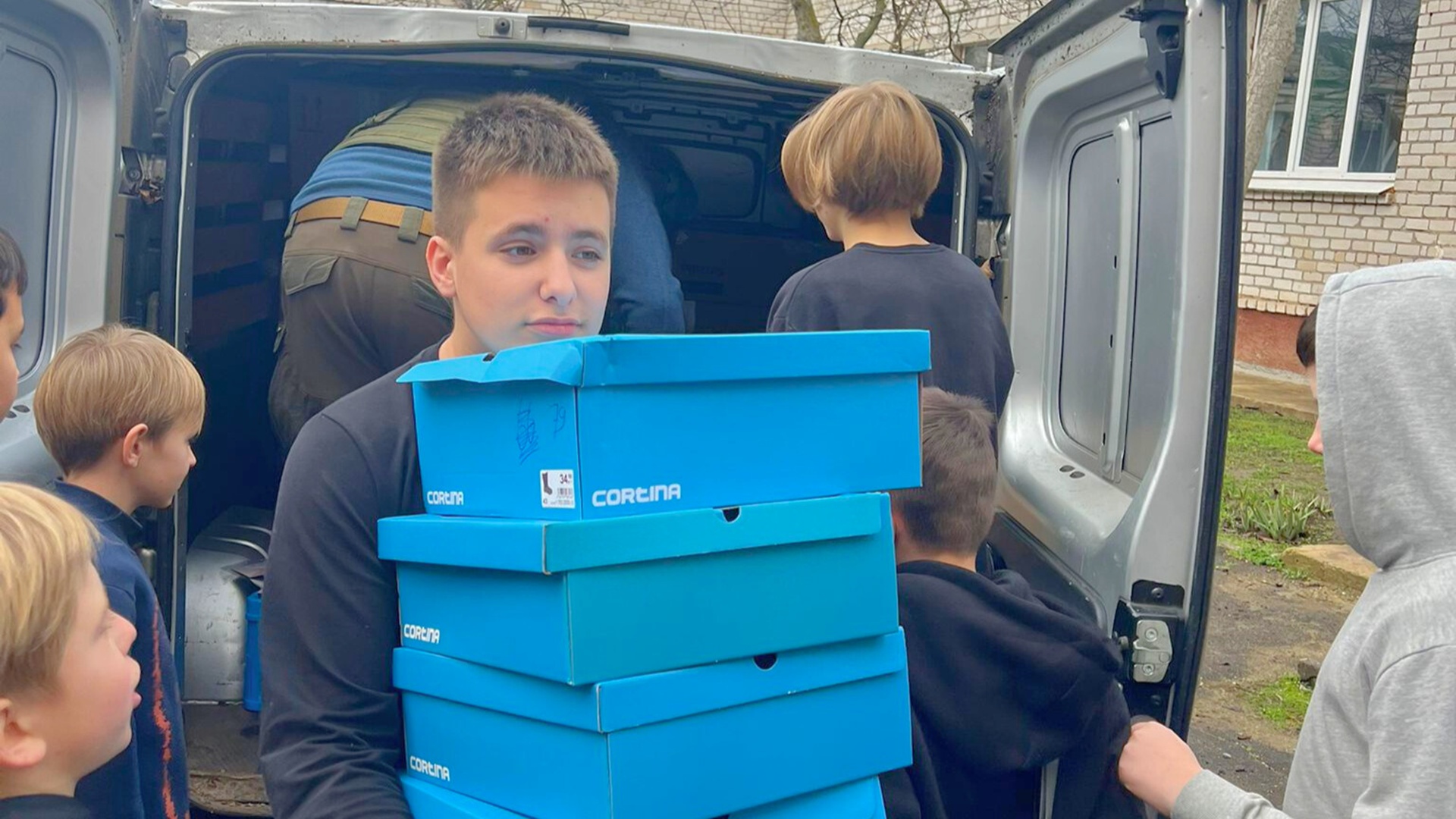 Kinderen in Ochakiv helpen met uitladen van kerstcadeaus en andere hulp vanuit Utrechtse Heuvelrug (foto: Johan Oldenburg)