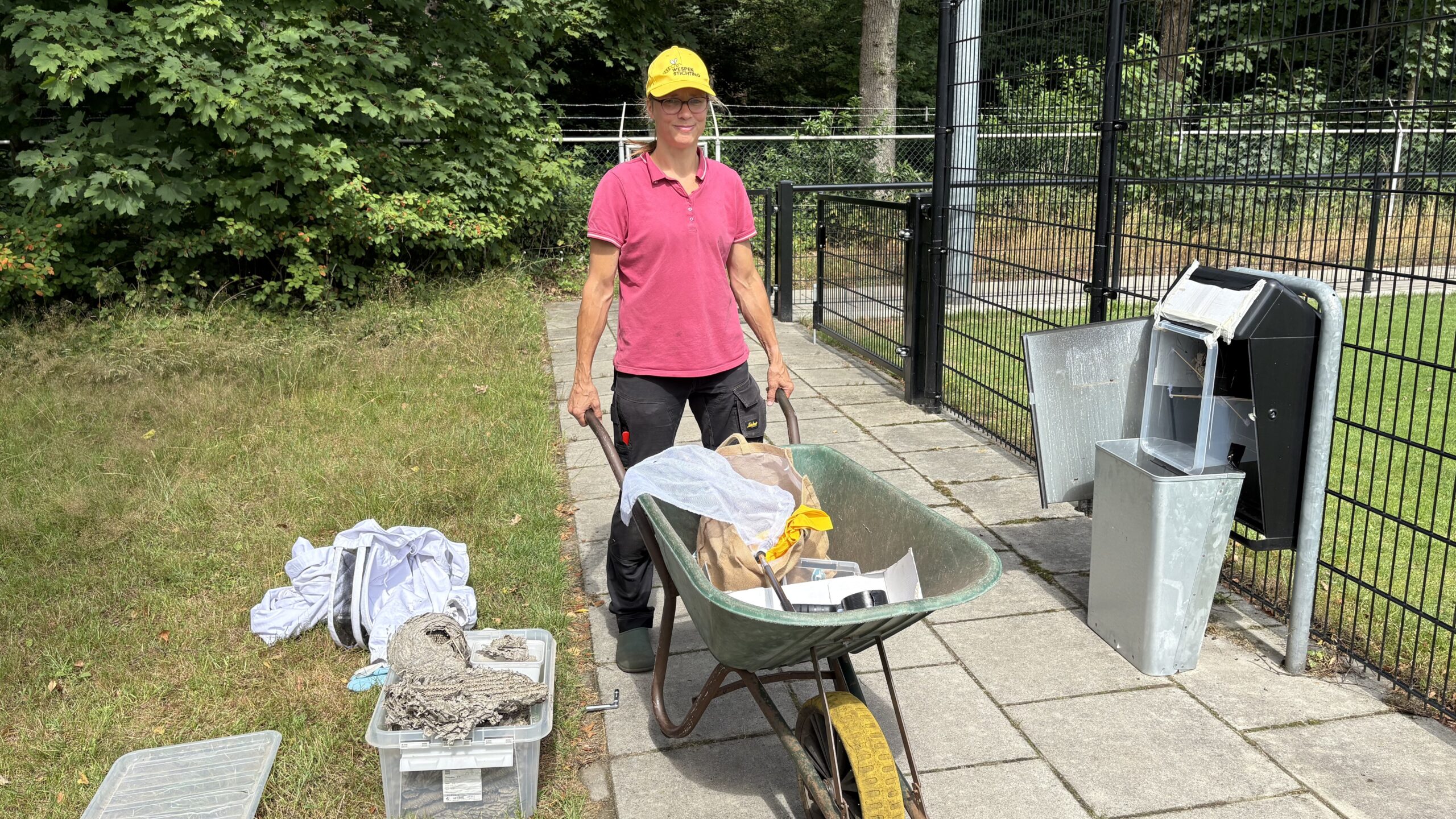 Gogelein laat zien hoe zij een wespennest verwijdert op een milieu- en diervriendelijke manier. “Ik heb een bak en daar zet ik met stokjes een plateautje neer, waar ik het nest op kan zetten. Dan trek ik mijn imkerpak aan en steek ik met een plamuurmes heel voorzichtig het nest los. Die vang ik op met mijn handen en zet ik daarna in een bak.” Dan is het nog niet klaar, Gogelein komt namelijk in de avond terug. “Dan zitten alle wespen op het nest en kan ik de bak dichtdoen. Daarna neem ik ze mee en zet ik de drie kilometer verderop weg, zodat ze niet weer terugvliegen.”