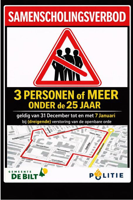 Het is verboden om met een groep van minimaal 3 personen onder 25 jaar samen te scholen. Het verbod geldt tot ten minste 7 januari. Met deze maatregel wil gemeente De Bilt proberen de voortdurende overlast van hangjongeren tegen te gaan. Eerdere maatregelen, zoals betonblokken en hekken rond het Lichtruim, en het contact met de jongeren hebben niet geholpen.