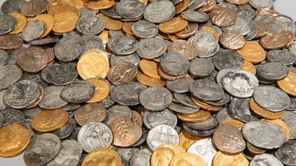 Twee amateur-archeologen met een metaaldetector hebben in oktober 2023 bij Bunnik 404 zilveren en gouden munten uit het begin van