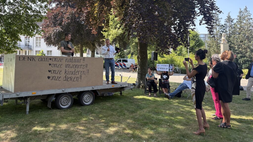Bij een landelijk AZC-protest voor het gemeentehuis in Bilthoven was een groepje van zo’n honderd mensen aanwezig vanuit het hele