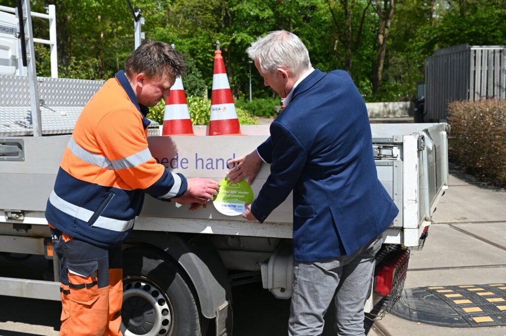 Begin mei plakten chauffeur Tijmen en aandeel- en wethouder Krischan Hagedoorn symbolisch de eerste sticker op een bus bij Biga