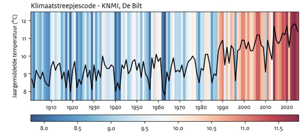 In de laatste decennia zijn veel jaargemiddelden boven het niveau van het begin van de twintigste eeuw uitgekomen, waardoor nieuwe streepjes meestal rood kleuren. Van het afgelopen decennium staat 2025 met 6 andere jaren in de top tien van warmste jaren. Daarmee past 2025 in een langer durende trend van een steeds warmer klimaat.