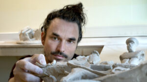 Ook de reizigers van weleer komen terug in een beeld. “Je ziet daarin de bovenweg op de Utrechtse Heuvelrug waar rovers, pelgrims en edelen slenteren en de benedenweg waar een klein middeleeuws leger voorbijtrekt met een eenzame geit. Onderin een bootje met vracht op de Rijn, want die rivier hoorde ook bij de weg. De eeuwenoude verhalen plaats ik boven elkaar, gebaseerd op schilderijen uit de middeleeuwen, waar men verhalen en tijden gewoon boven elkaar schilderde.” Martijn is na al het historisch graafwerk toe aan het ‘echte werk’: “Ik wil na al het voorwerk nu lekker gaan boetseren!”