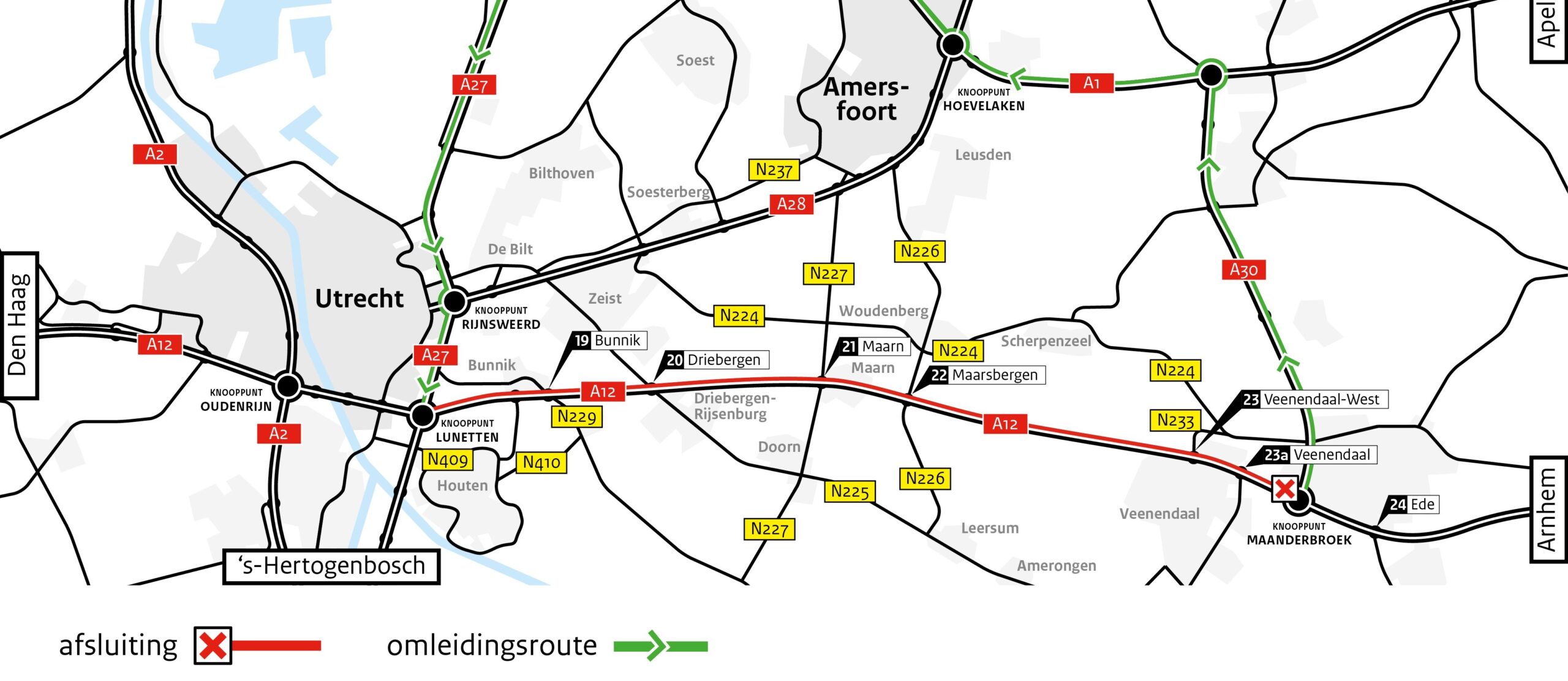 De eerste afsluiting is van vrijdag 9 mei 20.00 tot en met maandag 19 mei 05.00 uur. De tweede afsluiting is van vrijdag 22 augustus 20.00 tot en met maandag 1 september 05.00 uur. Het is afgesloten van knooppunt Maanderbroek tot aan knooppunt Lunetten. Daarmee roept Rijkswaterstaat weggebruikers op om tijdens de werkzaamheden zoveel mogelijk thuis te werken en niet de weg op te gaan als dat niet nodig is. Ook wordt opgeroepen alternatieve opties te gebruiken, zoals de trein of de fiets.