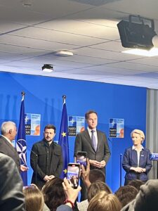 “Ik had gehoopt de vrouwelijke regeringsleiders te ontmoeten, zoals Halla Tómasdóttir van IJsland en Mette Frederiksen van Denemarken.” Dinsdag was ze als persbegeleider bij de meeting van de Europese Commissie met Ursula von der Leyen, Zelensky, Rutte en Antonio Costa van de Europese Raad. Al niet verkeerd. “Superspeciaal om zo dichtbij die mensen te staan. Woensdag stond ik ineens in de bijeenkomst van de North Atlantic Coucil. Daar waren ze zo’n beetje allemaal”, aldus een enthousiaste Schutte. “Ongelooflijk om dit mee te maken.”