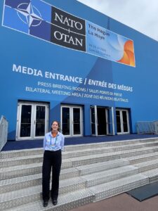 Als vrijwilliger bij de mediadienst begeleidde ze deze week de verzamelde wereldpers naar én van bijvoorbeeld de persconferentie van NAVO-topman Mark Rutte. Ook het beantwoorden van vragen en begeleiden van content creators hoorde bij haar taken. “Als mediawoordvoerder heb ik ervaring met persbegeleiding, dus dat kwam mooi uit. De inhoudelijke woordvoering lag bij de collega’s van de NAVO.”