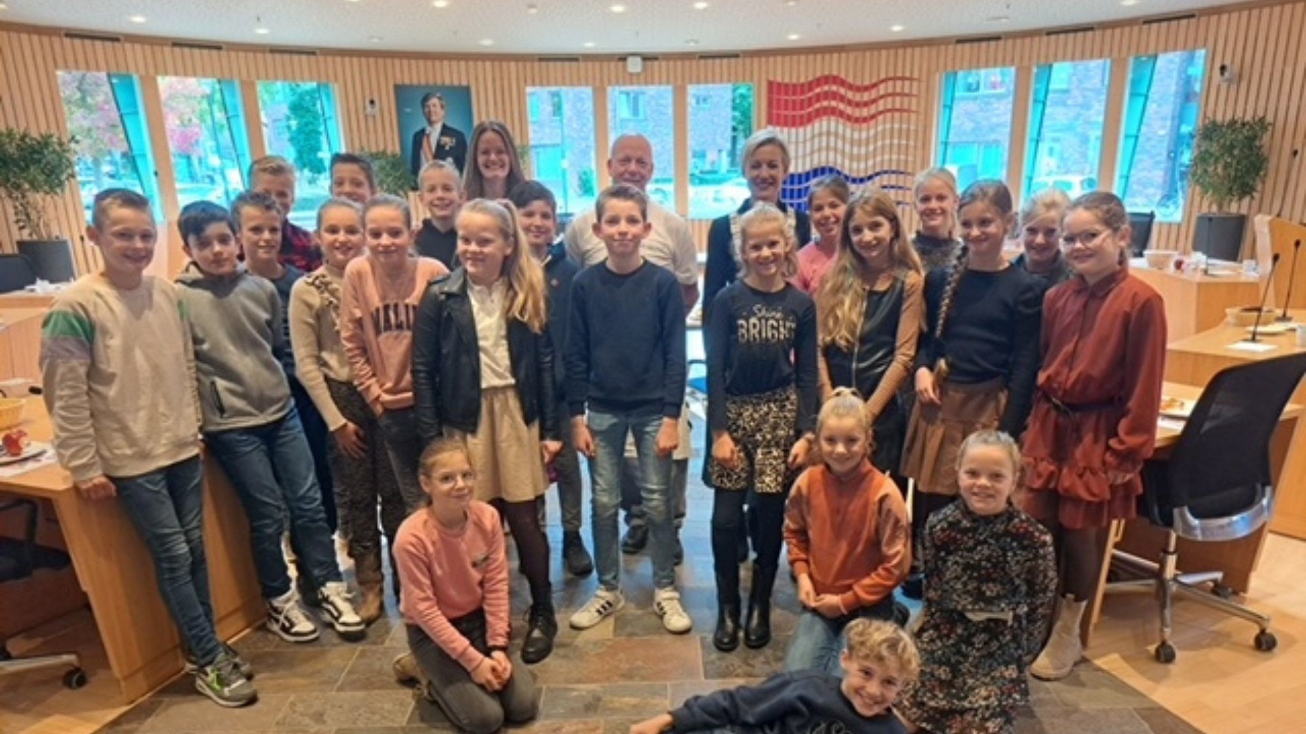 Kinderen van basisschool School met de Bijbel uit Langbroek hebben met burgemeester Iris Meerts en bakker Frank Lakerveld van een gezond ontbijt genoten in de raadzaal van Wijk Bij Duurstede.