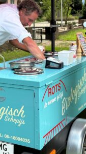Daar schept hij ook graag zijn bolletjes, en ook op de Amerongse Grietmarkt. “Ik ben er best goed in om een goed plekje te vinden. Op de braderieën en evenementen loopt het goed door, natuurlijk. Dan heb ik een rij voor mijn kar.” Het leuke van werken op rustiger plekken is dat hij een gesprek kan aanknopen. “Fietsers stappen af, maken een praatje. Dan kan ik iets vertellen over hoe ik mijn ijs maak zonder chemische toevoegingen. Want het is voor mij de sport om te laten zien dat je met biologische producten juist goede kwaliteit kan leveren.”