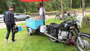 De klanten aan de ijscokar voor de kerk laten het zich goed smaken. Ook de motorrijder die op de provinciale weg langs kwam en die helemaal niet op zoek was naar ijs. “Die kar zag er zo gaaf uit. Dat wilde ik van dichtbij bekijken”, zegt hij met een bewonderende blik op de retro motorfiets waar Rogers ijscokar aan vastzit. “Het ijs is gelukkig ook bijzonder smakelijk.”