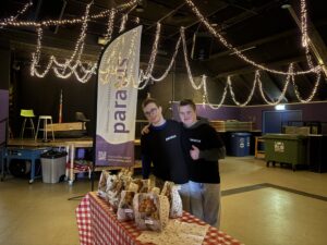 Jan, de student die aan de sponsorloop heeft deelgenomen, was ook aanwezig. “Vandaag ben ik DJ”, zegt hij enthousiast. “Met het opzetten van kerstmuziek is er een gezellige sfeer. Ik vond deze actie een geweldige ervaring. Het kerstgevoel en de sfeer, maar ook om dit met alle studenten van Paratus te doen. Ik ga dit nooit meer vergeten. Ik ben heel trots op de opbrengst die wij voor Spieren voor Spieren hebben opgeleverd.”