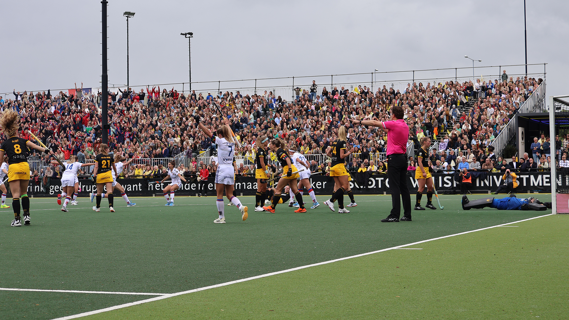 Feest voor Den Bosch, het publiek gaat uit het dak. Op aanmoediging van de stadionspeaker wordt ook voor SCHC nog eenmaal hard geapplaudisseerd. De speelsters van SCHC druipen langzaam af naar de eigen dugout. Hier heerst een doodse stilte. Ook coach Gilles van Hesteren staat er verslagen bij. “We hebben dit al vaker meegemaakt en ze verdienen meer. Verdrietige trots overheerst na zo’n wedstrijd.”