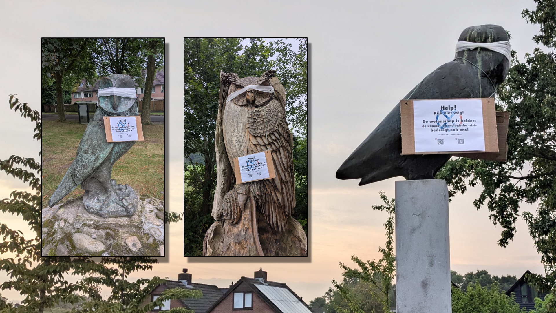 Leden van Scientist Rebellion en Extinction Rebellion Utrechtse Heuvelrug & Woudenberg hebben zondagmorgen verschillende uilen op de heuvelrug geblindoekt. Met de actie vragen de groepen aandacht voor de klimaatcrisis.