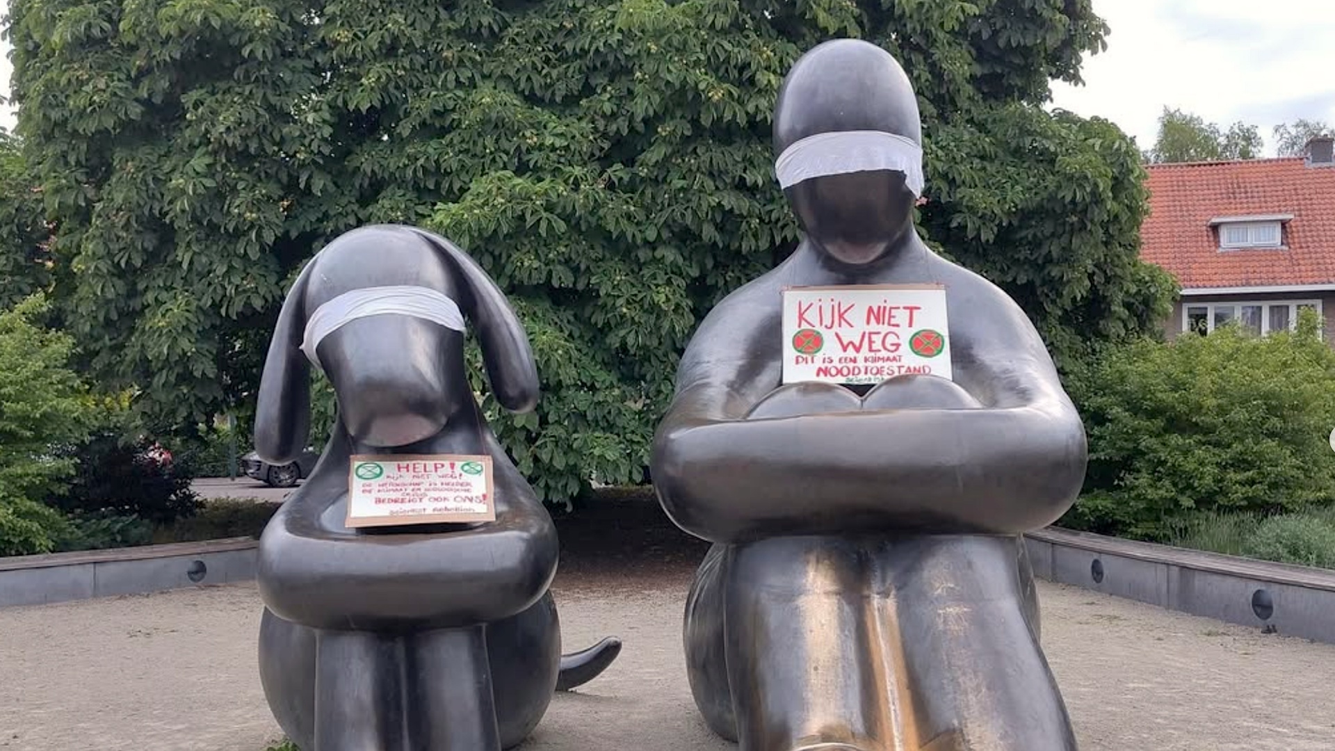 Enkele standbeelden in Zeist zijn zondag door actievoerders geblinddoekt. Extinction Rebellion Utrechtse Heuvelrug en Woudenberg en Scientist Rebellion vroegen met de actie aandacht voor de klimaatcrisis.
