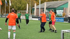 Het plezier spat er van af, van de 15 mannen en een vrouw die met elkaar ‘loopvoetballen’ op deze ongewoon zonnige novemberochtend. En ook de meegekomen familieleden –niet elke deelnemer kan zelfstandig naar het sportpark en weer naar huis komen– vinden een luisterend oor bij elkaar. Trainers/begeleiders Anton Ruijssenaars en Johan van der Snoek lachen net zo hard mee, maar verliezen de spelers niet uit het oog: ‘We moeten heel voorzichtig zijn met deze ploeg’.