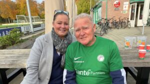 Ze heeft het er moeilijk mee, ook omdat haar man de diagnose ontkent. Het lotgenotencontact langs de lijn betekent veel voor haar. “Wat staat ons nog te wachten? Henny en ik zijn altijd overal met elkaar, gingen veel op pad. Het is een grillige ziekte. Hij is supersociaal, probeert iedereen het naar de zin te maken. Hier ook, kijk maar”, knikt ze naar haar man die geintjes maakt met iedereen in het veld. “Dan zie ik die filmpjes met bozige mensen. Ik hoop zó dat Hen zo blij blijft.”