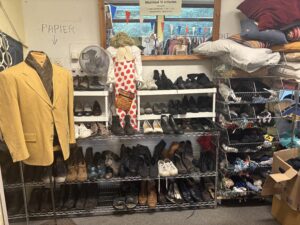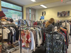 In de Wegggeefwinkel is van alles te vinden. “Hier zien jullie allerlei kleding uitgesteld”, vertelt Paasman tijdens de rondleiding, wijzend naar allerlei kleding. Er hangt van alles. “Er is gekeken of het schoon, heel en gangbaar is. Heel veel mensen denken dat er geen behoefte is aan ondergoed en BH’s, maar dat is er wel. Dus dat hebben we, en naast kleding hebben we ook tasjes.”