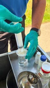 Het is belangrijk om secuur te zijn. De controles en dubbelchecks om ervoor te zorgen dat alle filtertjes, flessen en materialen volledig schoon zijn, kosten meer tijd dan een watermonster nemen op zich. “Als wij nu een fout maken, loopt dat mee door het hele proces. De meting is dan eigenlijk niets waard”, legt John uit. “Er zit meer in dan alleen een potje met water vullen.” Bij het werken ín/bij het water, gebruiken de monsternemers geen materialen die afgeven. “Die deeltjes zouden dan in het water kunnen komen en het monster daardoor beïnvloeden.”