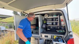 Zijn bedrijfswagen herbergt een klein laboratorium en een schat aan materialen –inclusief koelkast voor de watermonsters. De achterklep werpt wat schaduw op zijn tijdelijke werkplek. Geen overbodige luxe op een dag waarop het kwik de 33 graden Celsius aantikt. “Je hebt hier toch altijd nog wat koeling van het water”, relativeert John. “We zijn altijd buiten. Dat lijkt nu fantastisch, maar als je in de winter in de kou en wind staat te meten, staan de vingers weleens helemaal krom van de kou.”